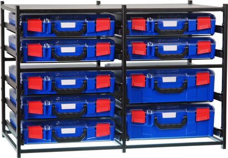 SFD2L7SA-BL StorageTek Dual Frame comes completely assembled with 2 large and 7 Blue ABS small cases with a clear PC lid. No fiddly screws and time wasted to assemble the frames. These complete frames are suitable for Electricians, Plumbers, Data Cable installers, HVAC, TV Antenna Installers, Mechanics and many others in business, office, workshop or at home. All frames can be screwed onto a floor of a van or under a bench or onto a work bench. Commercial build quality.