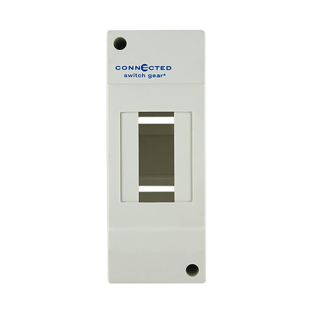 Connected Switchgears’ 2 pole surface mount enclosure module is manufactured from UV stable ABS material, so it won’t fade yellow or fade with age. All surface modules are made from flame retardant material, so it is fire resistant up to 660 degrees celsius. They are supplied with 35mm din rail switchgear mounts for mounting circuit protection devices. All surface modules are available in 1 to 18 pole.