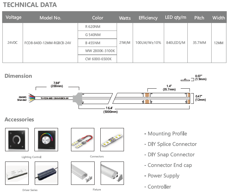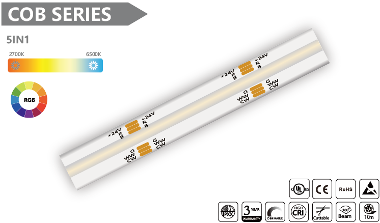 The COB (Chip On Board) Strip Light Series utilizes COB encapsulation, directly integrating LEDs onto circuit boards. This advanced LED package technology enhances thermal management, extending LED lifespan and ensuring high light flux density with minimal glare. The strips offer uniform illumination without dark areas and boast superior flexibility, allowing for arbitrary bending and 180-degree folding without damage.