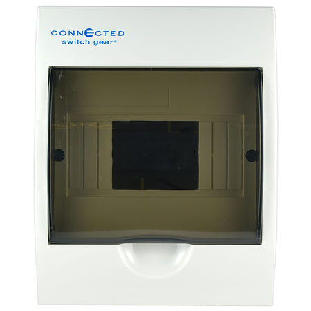 This is Connected Switchgears’ premium surface mounted 6 pole switchboard. It is manufactured from high grade polycarbonate materials that are UV stable. It has been manufactured this way so that it will not fade or yellow with age. All of our enclosures are made with flame resistant material, so the DBSMC6 is flame proof up to 660 degrees celsius.
