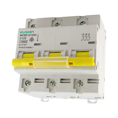 This is the FUSION Series 125A Circuit Breaker D Curve in 3 Pole 10kA. The FUSION Series range of circuit protection devices have been made from the highest grade components. This is to ensure reliability in all applications where protection against overload and short circuit is required. Because of this, all of our miniature circuit breakers comply with AS/NZS 60898.1 and AS/NZS 60947.2.