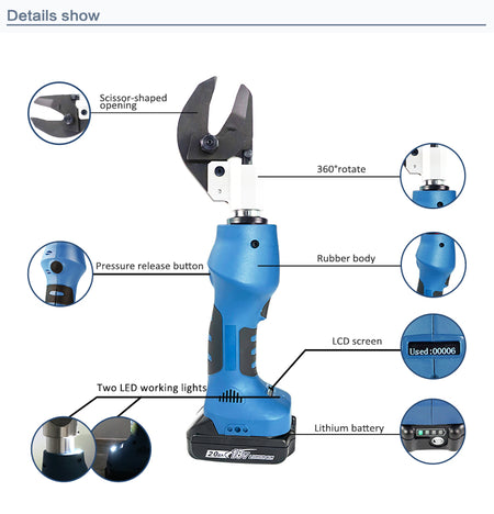 Introducing the ECT-32L Battery-Powered Mini Cutting Tool, meticulously engineered for precision and convenience in narrow working spaces. Its lightweight design and user-friendly operation make it an ideal choice for various cutting tasks. With a rotating head of 350 degrees, this tool provides enhanced flexibility and accessibility to fittings. It features automatic pressure relief and reset functionality, ensuring seamless operation with minimal effort. The scissor-shaped opening allows for easy access to fittings, further enhancing efficiency. Powered by a high-performance 18V lithium battery, equipped with a power display and fast charger, it offers reliable performance and rapid recharging for uninterrupted use. The built-in OLED display, coupled with an intelligent computer chip, facilitates easy information reading, while two LED working lights ensure visibility in dark areas. Housed in a durable PP plastic case, molded for strength and resistance to pressure and falls, it provides secure storage and transportation. With a cutting force of 1.5t and a maximum cutting capacity of Φ32mm single-core Cu/Al cable, the ECT-32L is your ultimate solution for efficient and precise cutting tasks.