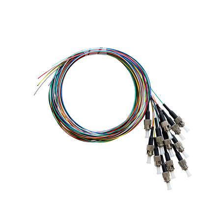 These packs of 12 colour coded pigtail leads are used in patch panel terminations, with the fibre end of the pigtail being spliced onto the fibre run, and the connector is inserted in a coupler/adaptor on the patch panel.