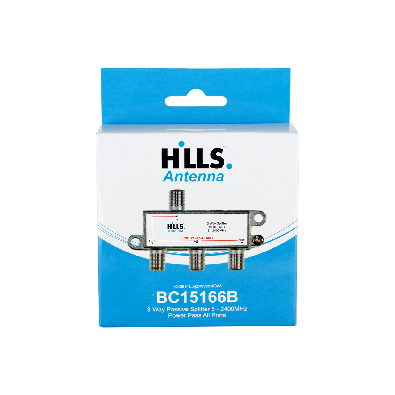 The Hills Antenna BC15166B 3-Way Passive Splitter divides the signal power into 3 equal portions. This is used when you require 3 TV outlets in the home and is designed for TV and Satellite signal applications 5 - 2400MHz. It is important to mount the splitter as as possible to the antenna. The roof cavity is a good location. The Splitter is designed for use with F-Type connections and also has an earthing lug, if so required.