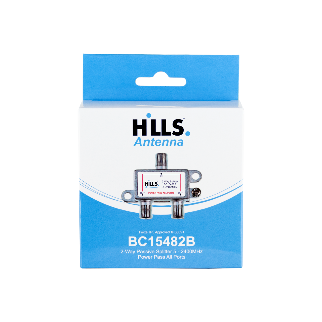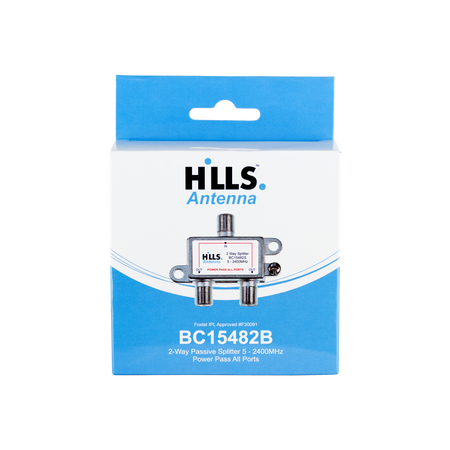 The Hills Antenna BC15482B 2-Way Passive Splitter divides the signal power into 2 equal portions. This is used when you require 2 TV outlets in the home and is designed for TV and Satellite signal applications 5 - 2400MHz. It is important to mount the splitter as as possible to the antenna. The roof cavity is a good location. The Splitter is designed for use with F-Type connections and also has an earthing lug, if so required.
