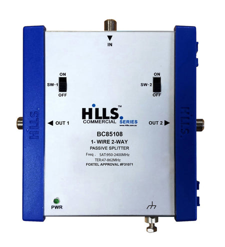 The Hills Antenna BC85108 is a DC switchable 2-way passive splitter that is 2.4GHz rated for Foxtel Stacker Satellite Technology.