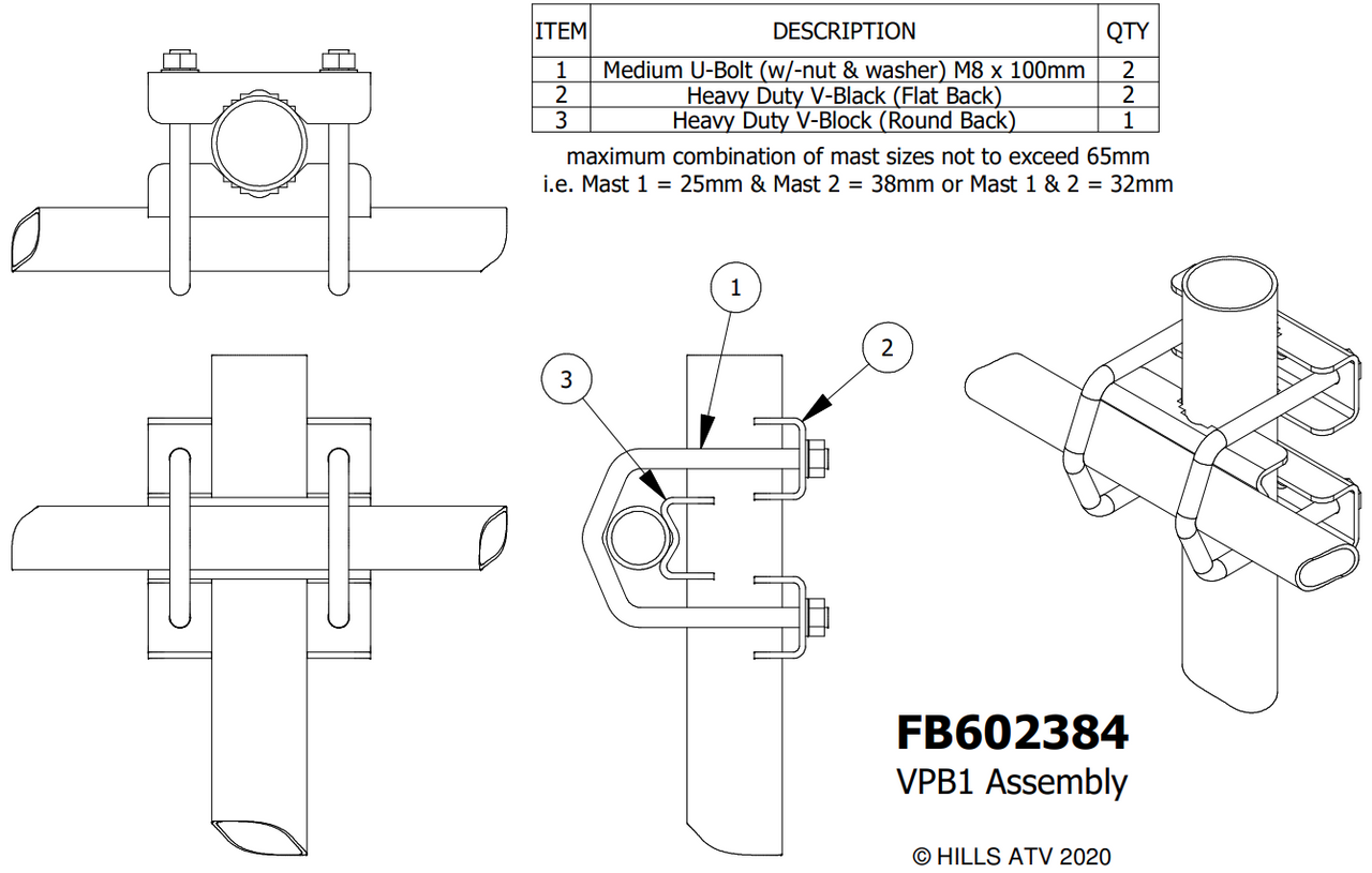 The Hills Antenna FB602384 VPB1 Assembly mount is required when an antenna is to be mounted for vertical polarity signal areas.
