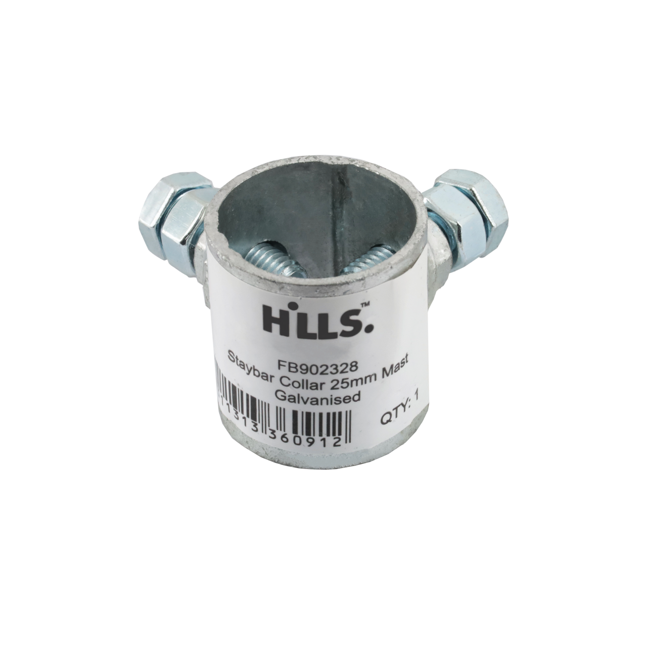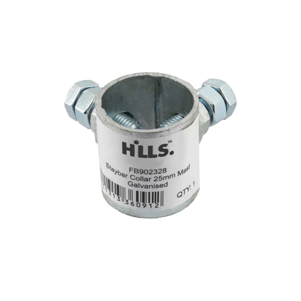 The Hills Antenna FB902328 25mm Stay Bar Collar is used in conjunction with a pair of stay bars to assist in bracing a mast or fascia bracket.