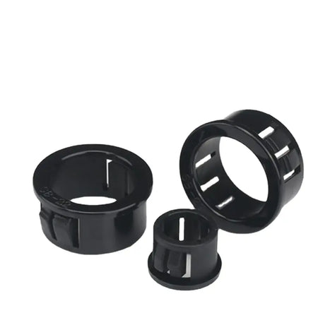 Nylon bushes are used to protect cables from sharp edges when they pass through penetrations, The 40mm nylon Bush is designed to snap into metal perforated holes that are 32mm. Or simply drill a 40mm hole and snap it in.