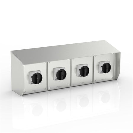 Complete with 4 x 32 A (3 pole) Allen-Bradley rotary isolator switches with black handles, 3 x internal separators, 4 x DIN rails, 4 x gasketed lids, captive lid fixing screws & earth terminals.