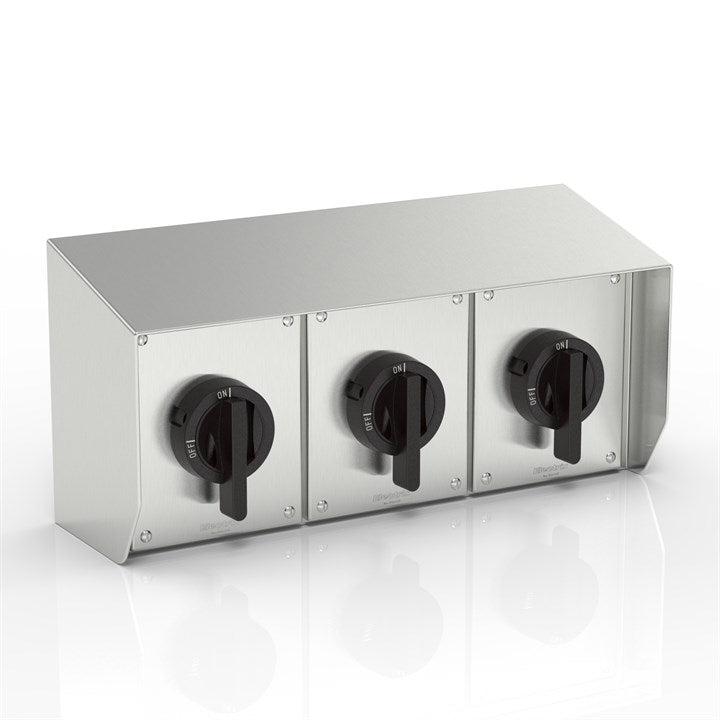 • Supplied With: 3 x Rotary Isolator Switches (32 A - 3 Pole), IP69K / IP66 Internal Threaded Wall Fixing Points, 2 x Internal Separators, 3 x DIN Rails, 3 x Lids with Gasket, Captive Lid Fixing Screws & Earth Terminals