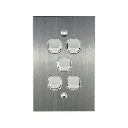 Stainless Steel Light Switch 5 Gang WHITE 10A 250V AC PLATINUM Series