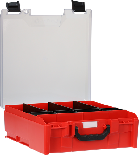 StorageTek Case Large Clear PC Lid c/w dividers-Red with Black Clasps