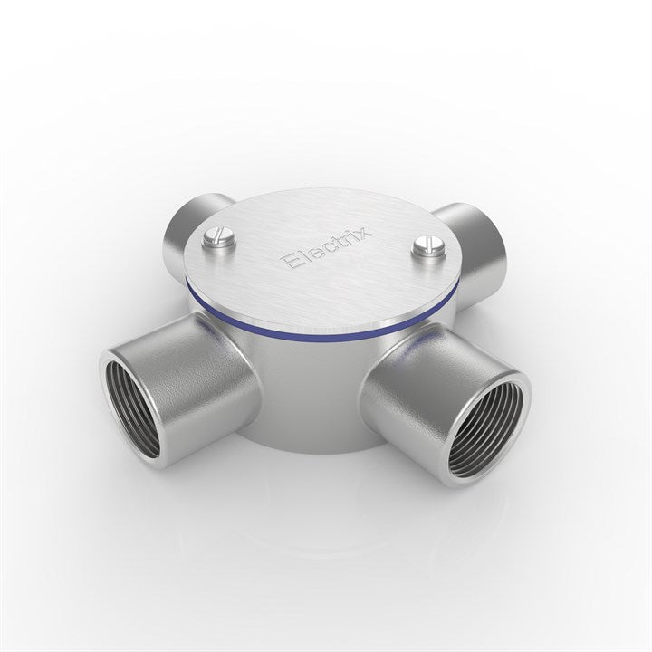Electrix® Metric Conduit Intersection Boxes, in 316C16F stainless steel with a 316L - V4A - 1.4404 stainless steel lid, can be used to change direction during an installation and to provide additional outlets for conduit runs, whilst the removable lid provides access for inspection and installation purposes.
