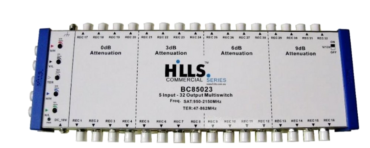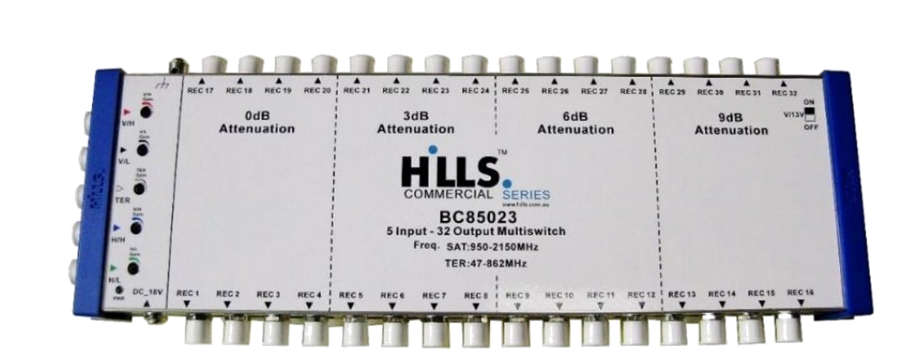 The Hills Antenna 5-Wire Multi-Switches are suitable and approved for use in FOXTEL PAY TV installations with SMATV applications. Available in 12 outputs (BC84492), 16 outputs (BC84493), 24 outputs (BC84494) & 32 outputs (BC85023).