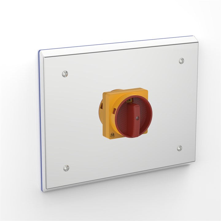 配有 Allen-Bradley 旋转隔离开关/隔离开关(63 A - 6 极 -查看规格)、带蓝色硅胶垫片的固定法兰、8 x 40 mm 自攻螺钉、DIN 导轨(配有安装的接地块和辅助装置)触点)、衬垫盖、外加盖固定螺丝、接地端子和接地线。