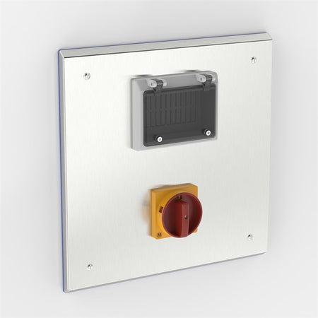 配有 Allen-Bradley 旋转隔离开关/隔离开关(63 A - 3 极 -查看规格)、IP66 铰链观察窗(6 个模块宽 - 108 毫米)、带蓝色硅胶垫圈的固定法兰、8 x 40 毫米自锁式自攻螺钉、DIN 导轨 x2(配有已安装的接地块和辅助触点)、衬垫盖、外加盖固定螺钉、接地端子和接地线。