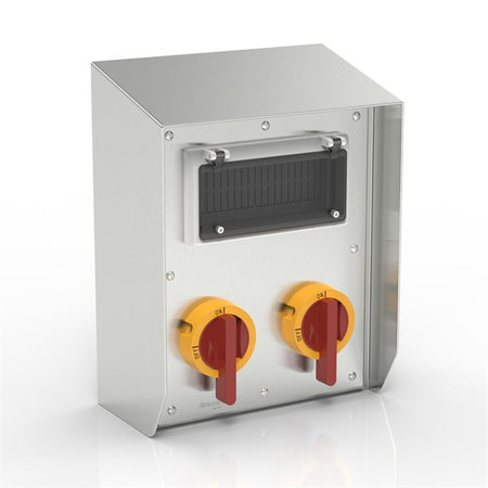 配有2 x 32 A(3 极) Katko 旋转隔离开关、铰链观察窗(8 个模块宽 – 144 毫米)、2 x DIN 导轨、衬垫盖、外加盖固定螺丝和接地端子。