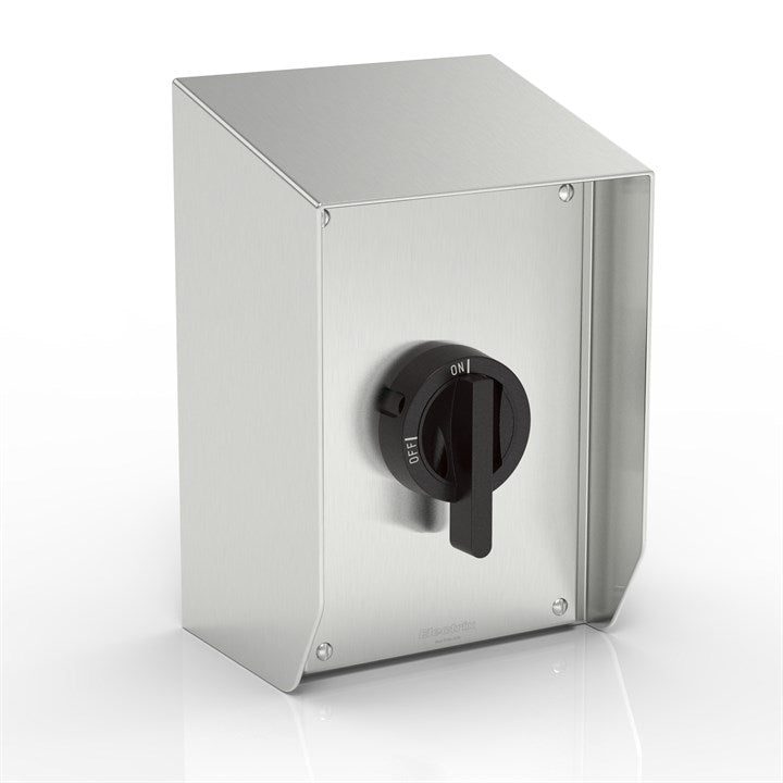 - 随附:旋转隔离开关(63 A - 3 极)、IP69K / IP66 内螺纹墙壁固定点、DIN 导轨、带垫圈的盖子、外加盖子固定螺钉和接地端子